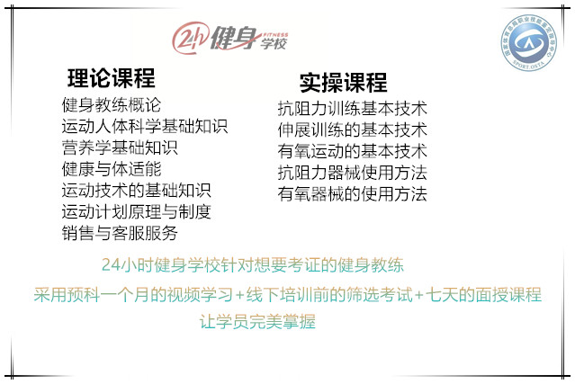 健身教练培训网针对想要考证的健身教练采用预科一个月的视频学习+线下培训前的筛选考试+七天的面授课程,让学员完美掌握知识全面提高国考的通过率而努力=3280元课程费用(初级) 3880元课程费用(中级)